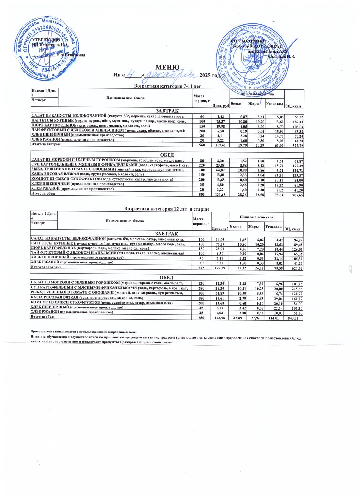 МАОУ СОШ №1 обеспечивает рациональное и сбалансированное питание детей в соответствии с основным (организованным) десятидневным и двенадцатидневным меню, разработанным для двух возрастных категорий: для детей с 7 лет до 11 лет и для детей с 12 лет и старше.